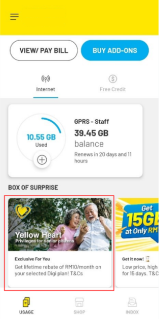Through the Digi Yellow Heart initiative, all senior citizens and Person with Disabilities (PWD) are eligible for a lifetime rebate of RM10 on their monthly postpaid bill.
