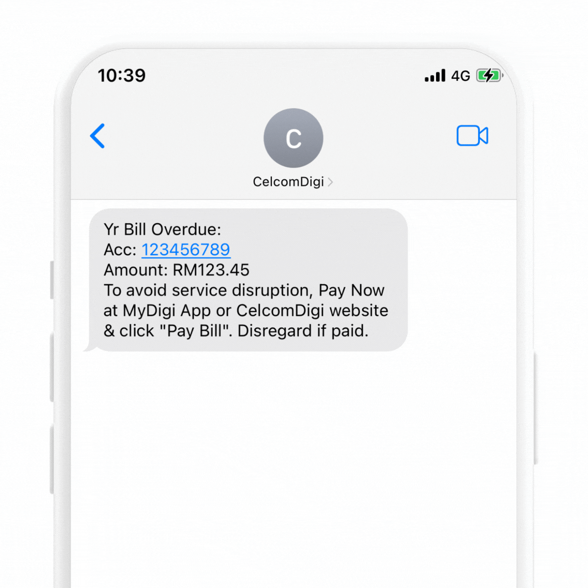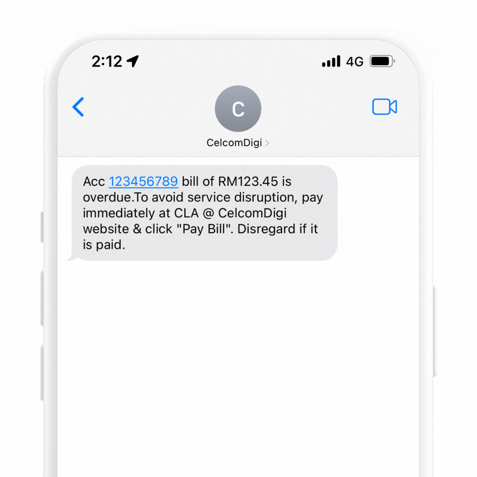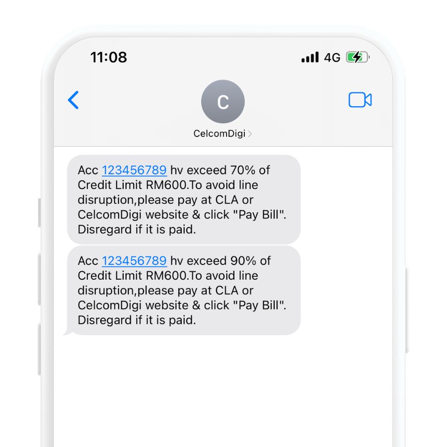2. Prior to barring, you will receive a few SMS reminders from CelcomDigi to pay your bills. If you haven't paid your bills by then, please do so immediately to avoid service interruptions. The screenshots below show some of the SMS reminders you will receive: