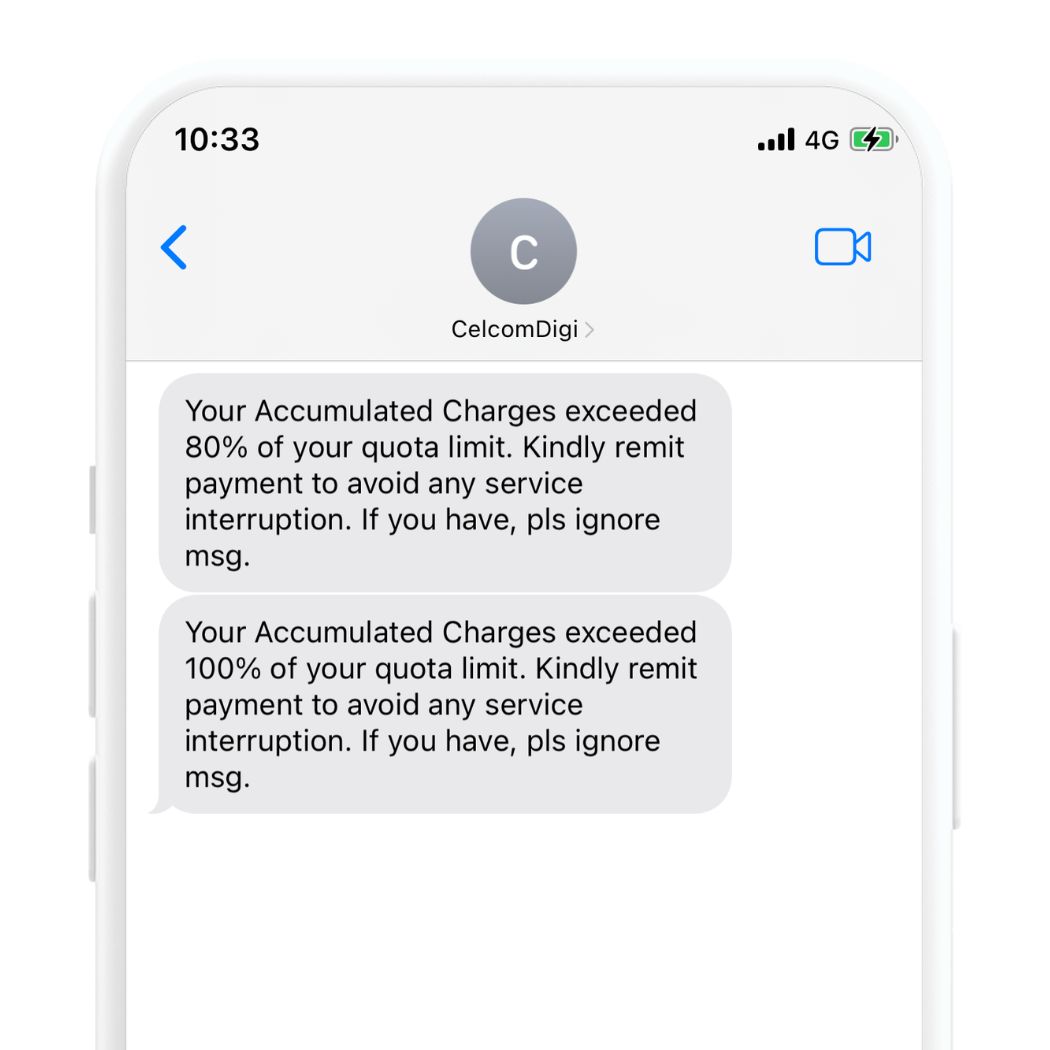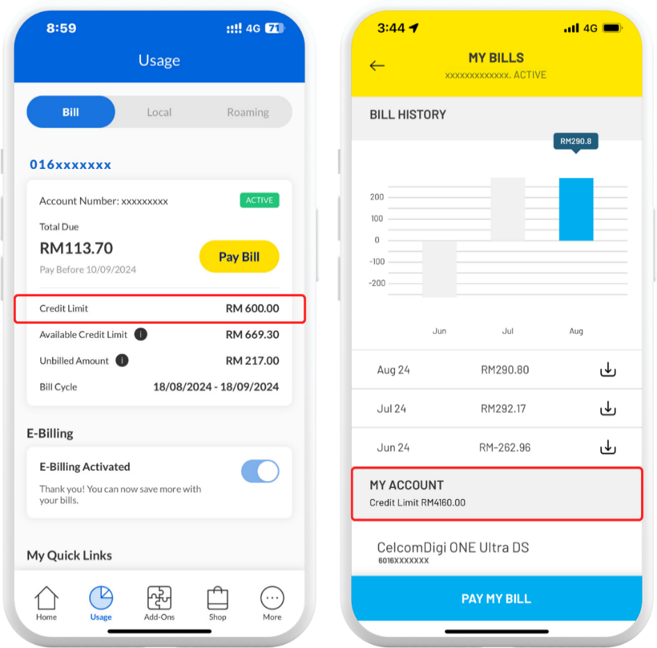 All postpaid plans come with a credit limit. Your usage and purchases made via the Celcom Life or MyDigi app will be charged to your postpaid bill and count towards your credit limit. Once you have used up 100% of your credit limit, your line will be immediately barred, regardless of your bill cycle.