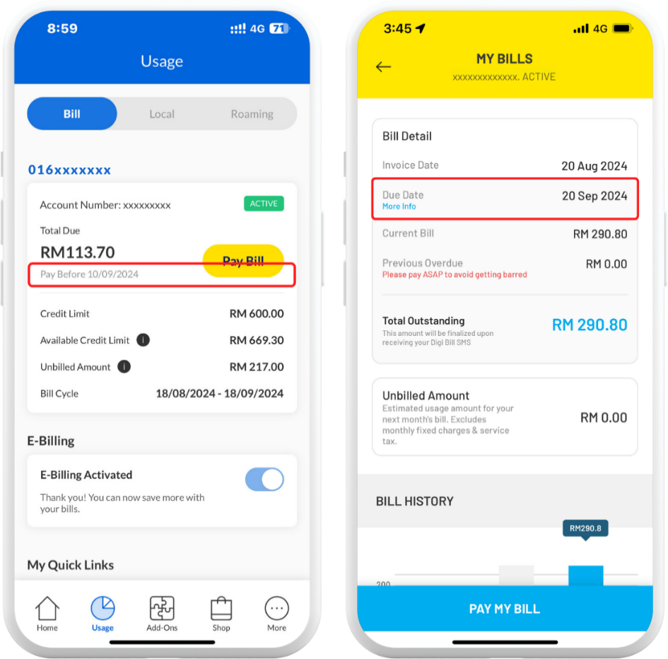 The issuance of your bill statement depends on when you first activate your postpaid line. You will be assigned a bill cycle date closest to your Postpaid line activation. You can check your bill due date via the Celcom Life or MyDigi app.