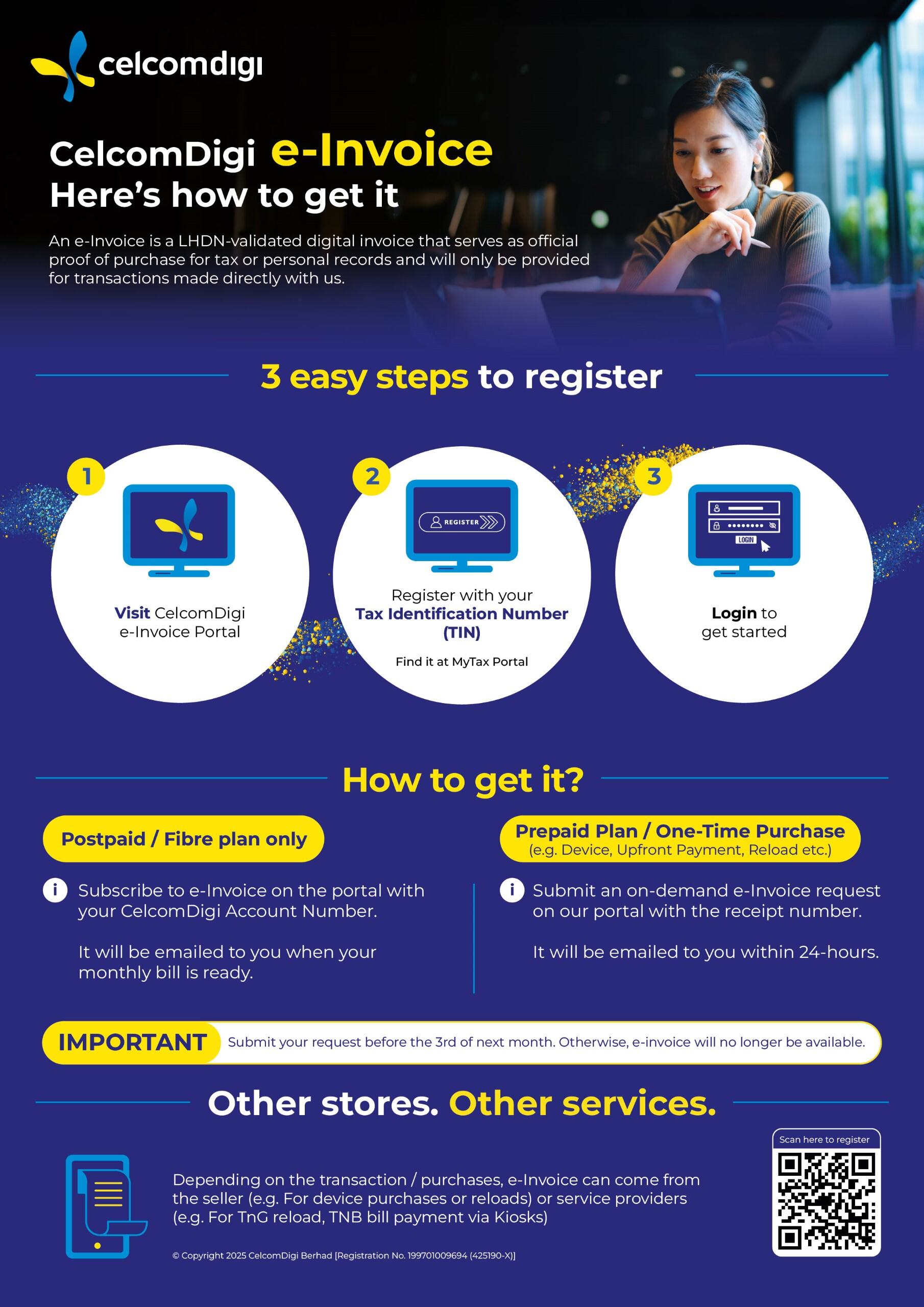 In compliance with the Inland Revenue Board of Malaysia (IRBM) e-Invoice initiative, CelcomDigi will begin implementing e-Invoices on 1 July 2025.