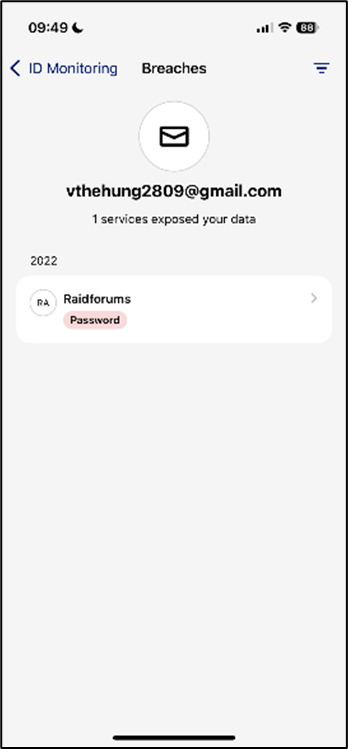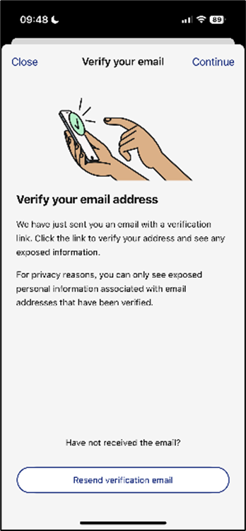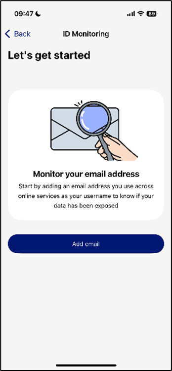 Step 1: Add email Select ‘ID Monitoring’ Tap ‘Continue’ Tap ‘ add email’ Input email and tap ‘Save’ Tap continue