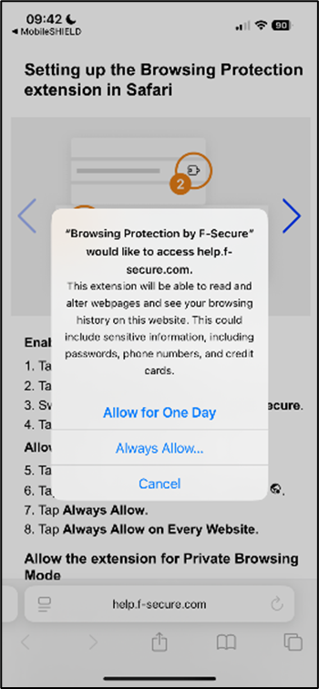 Step 2: Enable Access for Safari Protection Tap ‘Set up’ Then tap on ‘Get started’ Tap ‘Always Allow’ access for Safari Protection (including banking and shopping protection) Manage Extensions & ‘enable browsing Protection by F Secure’ Safari browsing extension enabled! Your browsing on Safari is now protected