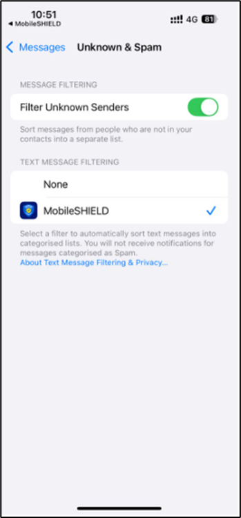 Step 2: Enable access for SMS Protection After tap ‘Setting’ Go to ‘Unknown & Spam’ in Message Filtering section Tap ‘Enable’ Select ‘MobileSHIELD’ and toggle on ‘Text Message Filtering’
