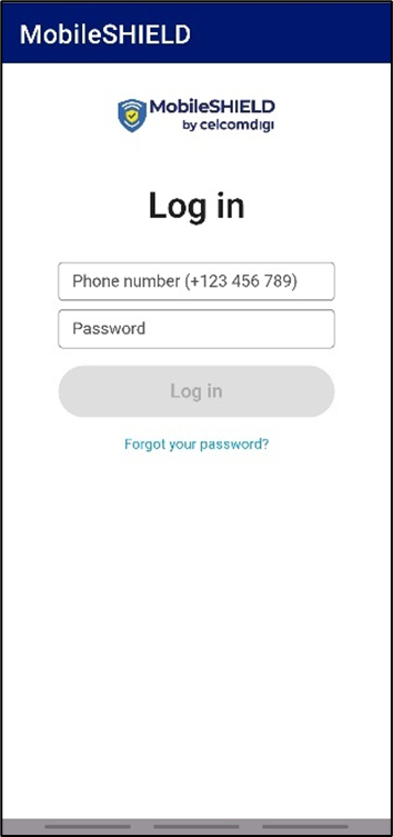 Steps Review End User License Terms Tap ‘Accept and continue’ Input phone number (+601xxxxxxxx) Key in temporary password (refer to MobileSHIELD Welcome SMS) Tap ‘Continue’ to login