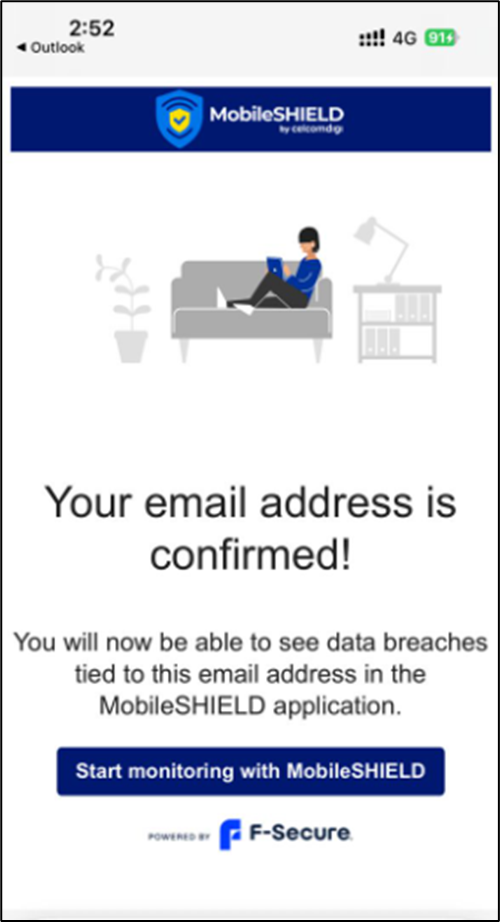 Step 2: Verify email Look for MobileSHIELD email titled tab confirm you email address Tap Confirm email address Your email address is confirmed! MobileSHIELD ID Monitoring is now active and will start monitoring your email for breaches on the dark web