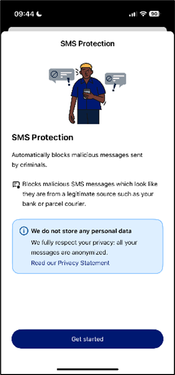 Step 1: Get started no SMS Protection Tap ‘Scam Protection’ Then ‘SMS Protection’ and ‘Get started’ Tap on ‘SMS protection, Setup required’ Tap on ‘Settings’