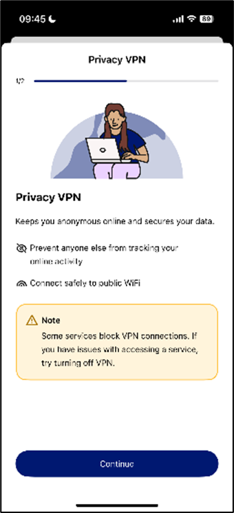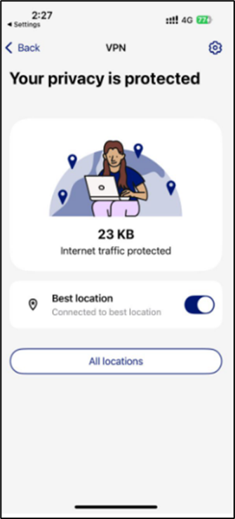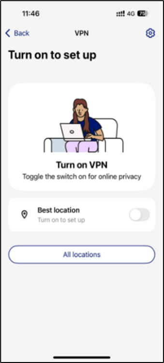 Steps: Go to ‘ VPN’ Set up required Tap on ‘Continue’ Turning on VPN than tap ‘Got it’ Turn on to set up toggle ‘Best location’ Your privacy is protected