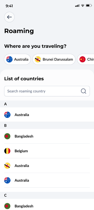 Step 2: Choose the country for which you want to buy the roaming pass. | ![]() |