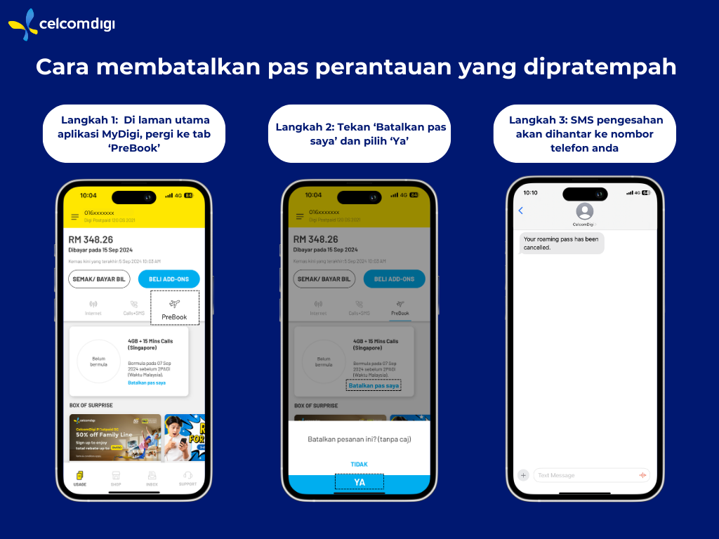 Anda digalakkan membeli pas roaming sebelum berlepas untuk mengelakkan caj tidak dijangka di luar negara. Anda boleh melakukannya dengan mudah melalui aplikasi Celcom Life atau MyDigi. Pengaktifan awal memberi ketenangan fikiran dan memastikan anda terus mendapat sambungan sebaik sahaja tiba.
