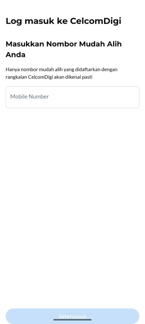 Langkah 3: Untuk log masuk kali pertama, masukkan nombor Celcom atau Digi anda. Tekan ‘Seterusnya’. | ![]() |