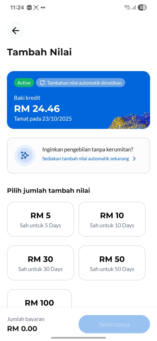 Jika anda ingin tambah nilai menggunakan PIN, ikuti langkah-langkah di bawah: