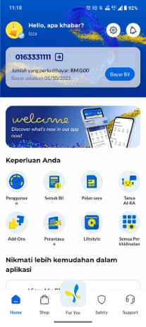 Langkah 1: Di halaman utama aplikasi CelcomDigi anda, klik 'Semua Perkhidmatan' di bawah kategori 'Keperluan Anda'. | ![]() |